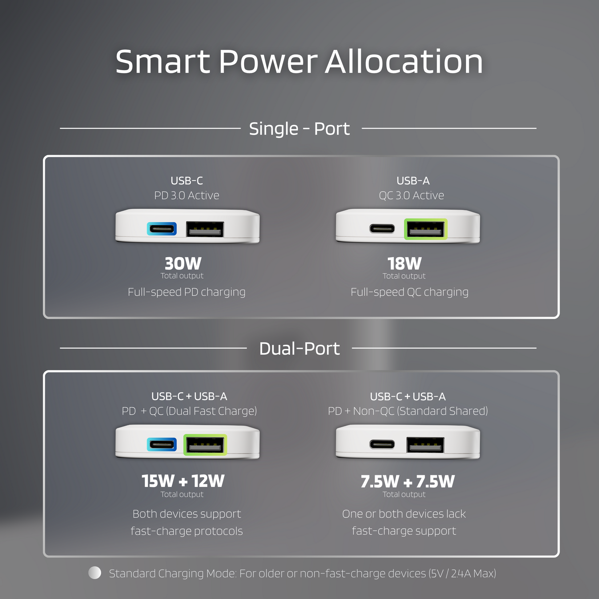 Ports: 1x USB-C (30W Max), 1x USB-A (18W Max)