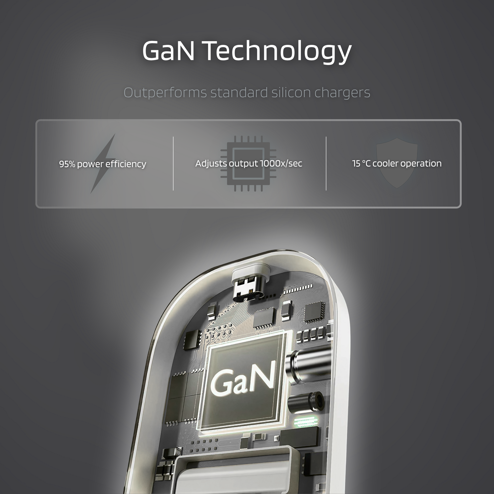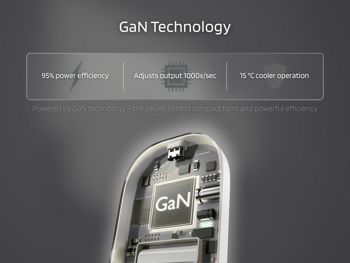 Next-generation GaN semiconductors deliver 95% power efficiency while keeping the charger cool and ultra-slim.
