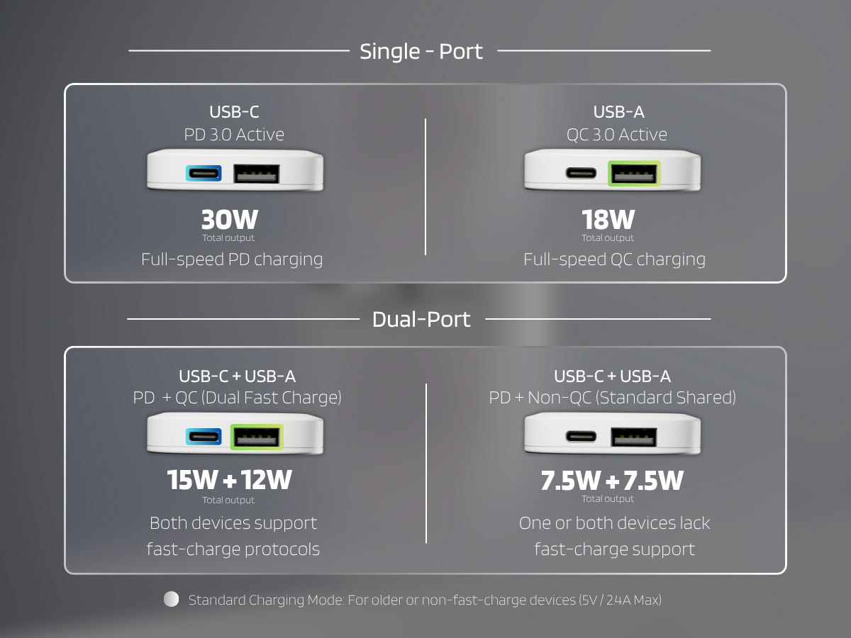 Whether using one port or both, you’ll always get the fastest and safest charge possible — no overheating, no wasted energy.