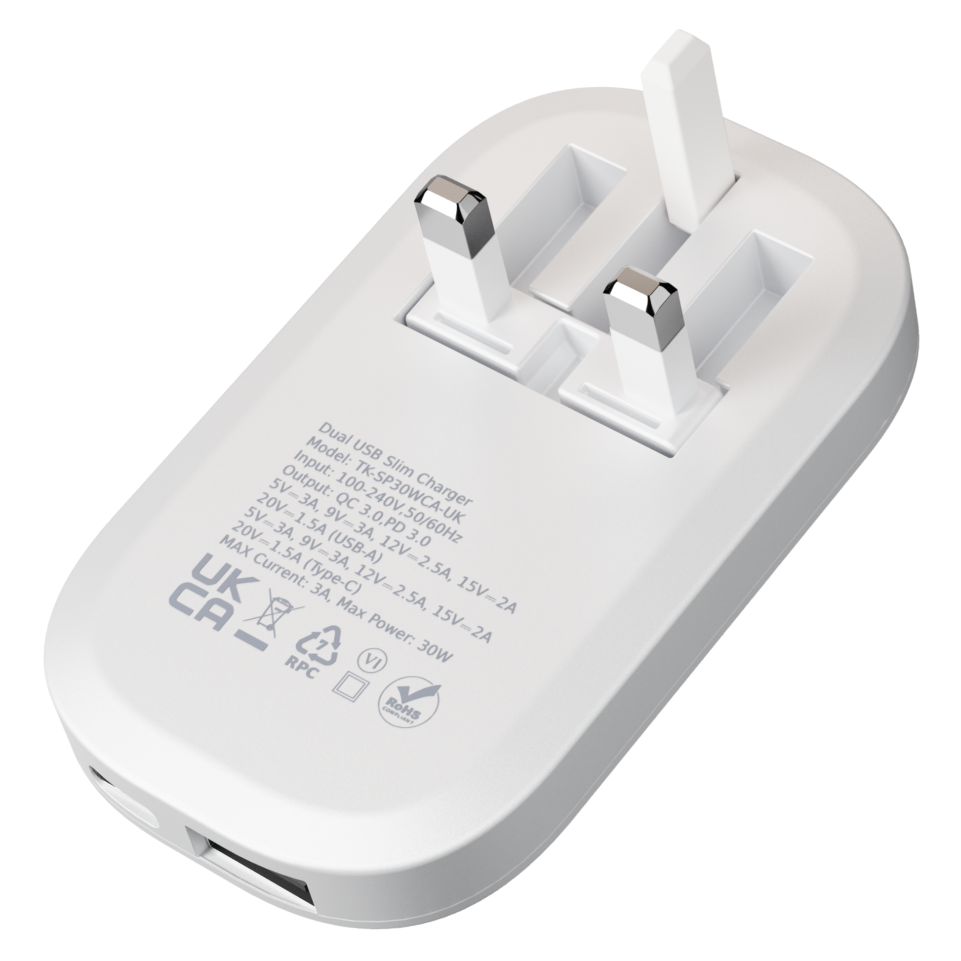 The TEKRAT Slim UK Plug supports 30W fast charging, but this speed can only be achieved via the USB-C port.